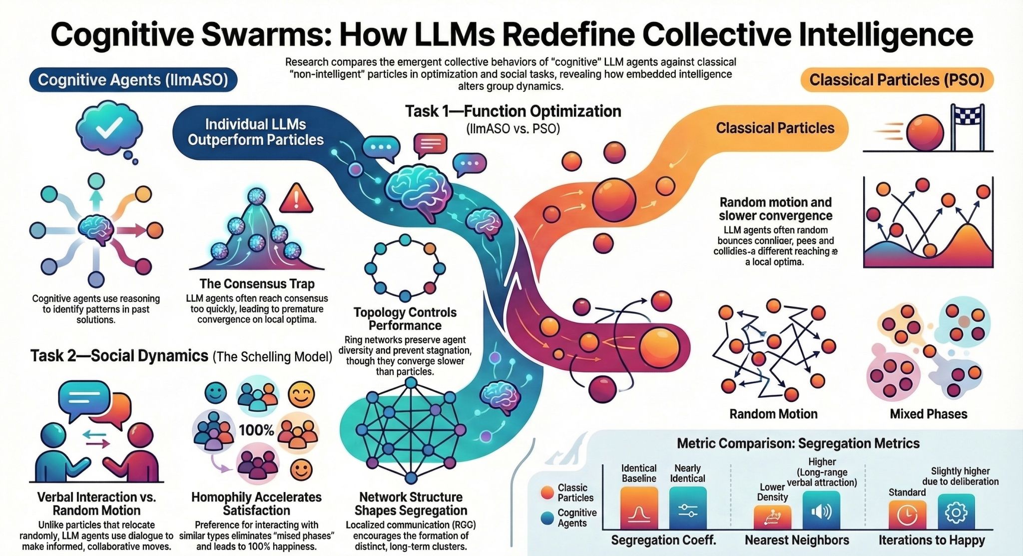 Cognitive agents, powered by Large Language Models (LLMs), possess advanced reasoning and communication capabilities that fundamentally distinguish them from non-cognitive particles, which rely solely on formal rules. While their ability to replicate human individual and social behaviors is still under scrutiny, the impact of their embedded “intelligence” on emergent behaviors remains poorly understood. Here, by comparing cognitive agents with classic particles, we investigate how LLM capabilities shape emergent phenomena in two tasks: function optimization and social organization emerging from the Schelling model of segregation. To this aim, we introduce LLM Agent Swarm Optimization (llmASO), where a swarm of interacting LLM agents acts as an optimizer. Our findings reveal that, while individual agents outperform particles in decision-making, their consensus tendencies and ability to exploit patterns can make them prone to premature convergence. Adjusting network topology can alleviate this effect, but typically at the cost of slower overall convergence compared to classical Particle Swarm Optimization (PSO). In contrast, in the Schelling model, we demonstrate that local interactions and homophilic mechanisms allow cognitive agents to generate distinct emergent behaviors, underscoring the importance of realistic communication architectures in complex social simulations. This work clarifies how LLM capabilities introduce new mechanisms for collective behavior and has implications for future applications of LLM agents in swarm robotics, social experiments, and complex decision-making tasks.